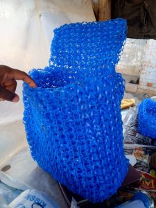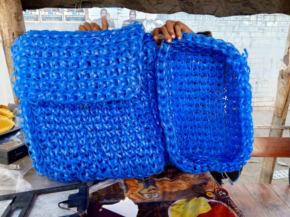 Munashe gathers the plastic rings from local bottle stores and littered streets, and then carefully weaves them into colourful and durable items. Some of his work is sold through the family’s market stall; other pieces are donated to neighbours and local groups.